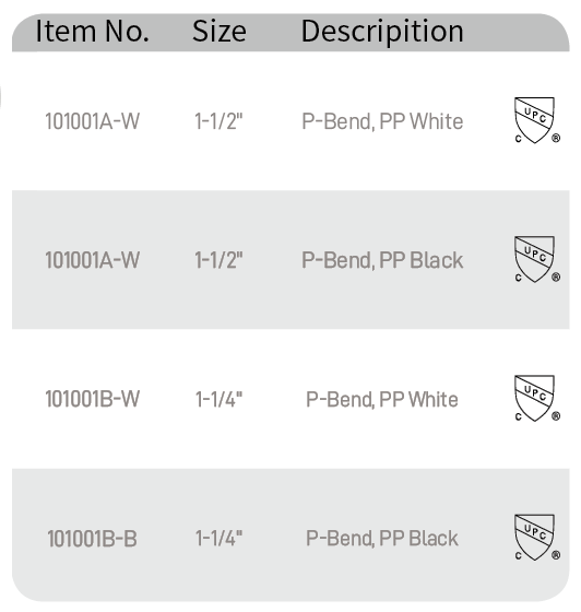 Product Name P Bend Model Number 101001A-W Download Link Parameter Odour ProofNot Odour Proof CertificatecUPC Wastewater Type Domestic Wastewater Plastic Tubular P-Trap with Threaded Adapter Plated P-Trap Lavatory Trap Telescope End Outlet Waste with Branch Clear P-Trap P-Trap with Reversible J-Bend P-Trap with Threaded Adapter and Flange P-Trap with Solvent Weld Adapter P-Trap Repair Trap with Sch40 Solvent Adapter Repair Trap Bathtub Trap S-Trap with Threaded Adapter and Flange S-Trap with Threaded Adapter S-Trap with Solvent Weld Adapter Washing Machine Trap End Outlet Waste Hi-Line End Outlet Waste Telescope End Outlet Waste Hi-Line Telescope End Outlet Waste Telescope End Outlet Waste with Branch Hi-Line Telescope End Outlet Waste With Branch Disposer Kit Center Outlet Waste Hi-Line Center Outlet Waste Offset Traps J Bend Bathtub Trap 90° Elbow Flexible Coupling Flexible J-Bend Flexible P-Trap Slip Nut Form-N-Fit Plastic Tubular Form-N-Fit Plastic Tubular Form-N-Fit Plastic Tubular Form-N-Fit Plastic Tubular J Bend Flange Slip Nut J Bend Slip Nut Extension Tube Slip Washer Tailpiece Washer Extension Tube Reducing Washer Slip Washer Flanged Tailpiece Tailpiece Washer Reducing Washer Flanged Tailpiece Rubber Tailpiece Washer Reduciang Washer Branch Tailpieces Rubber Slip Washer Rubber Slip Washer/Bowl Branch Tailpieces Reduciang Washer Rubber Reducing Washer Branch Tailpieces Straight Tube Extension Tubes with Solvent Weld Joint Double Connect Solvent Weld Extension Tube Waste Arms Waste Arms 90° Elbow 90° Elbow 90° Elbow Rubber Flat Washer 90° Elbow 45° Elbow Tee Slip Joint Connector Center Outlet Tee End Outlet Tee Coupling Form-N-Fit Plastic Tubular Threaded Adapter Reducer Adapter Solvent Weld Adapter Flexible Extension Tube