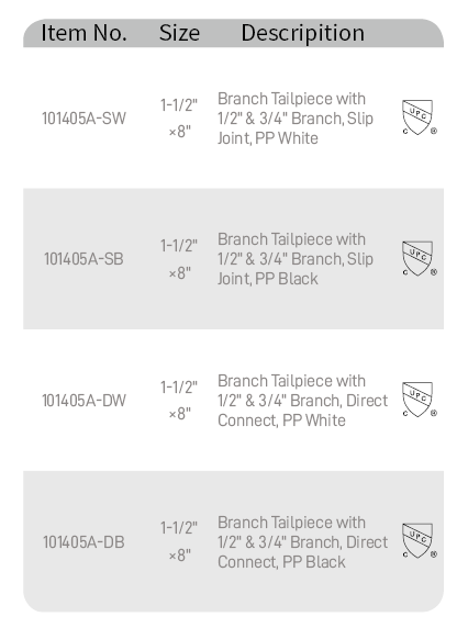 Product Name Branch Tailpieces Model Number 101405A-SW Download Link Parameter ColorWhite or Black Odour ProofNot Odour Proof Certificate cUPC Plastic Tubular P-Trap with Threaded Adapter Plated P-Trap Lavatory Trap Telescope End Outlet Waste with Branch Clear P-Trap P-Trap with Reversible J-Bend P-Trap with Threaded Adapter and Flange P-Trap with Solvent Weld Adapter P-Trap Repair Trap with Sch40 Solvent Adapter Repair Trap Bathtub Trap S-Trap with Threaded Adapter and Flange S-Trap with Threaded Adapter S-Trap with Solvent Weld Adapter Washing Machine Trap End Outlet Waste Hi-Line End Outlet Waste Telescope End Outlet Waste Hi-Line Telescope End Outlet Waste Telescope End Outlet Waste with Branch Hi-Line Telescope End Outlet Waste With Branch Disposer Kit Center Outlet Waste Hi-Line Center Outlet Waste Offset Traps P Bend J Bend Bathtub Trap 90° Elbow Flexible Coupling Flexible J-Bend Flexible P-Trap Slip Nut Form-N-Fit Plastic Tubular Form-N-Fit Plastic Tubular Form-N-Fit Plastic Tubular Form-N-Fit Plastic Tubular J Bend Flange Slip Nut J Bend Slip Nut Extension Tube Slip Washer Tailpiece Washer Extension Tube Reducing Washer Slip Washer Flanged Tailpiece Tailpiece Washer Reducing Washer Flanged Tailpiece Rubber Tailpiece Washer Reduciang Washer Branch Tailpieces Rubber Slip Washer Rubber Slip Washer/Bowl Branch Tailpieces Reduciang Washer Rubber Reducing Washer Straight Tube Extension Tubes with Solvent Weld Joint Double Connect Solvent Weld Extension Tube Waste Arms Waste Arms 90° Elbow 90° Elbow 90° Elbow Rubber Flat Washer 90° Elbow 45° Elbow Tee Slip Joint Connector Center Outlet Tee End Outlet Tee Coupling Form-N-Fit Plastic Tubular Threaded Adapter Reducer Adapter Solvent Weld Adapter Flexible Extension Tube